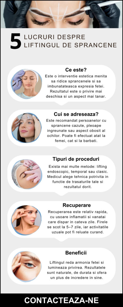 | Ce presupune liftingul de sprancene? | Este o procedura estetica prin care se ridica pielea de la nivelul ochilor si sprancenelor. |